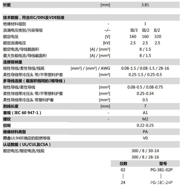 接線端子排型號常用英文字母、數(shù)字、拼音字母的方式,來標明接線端子排電流量、尺寸和端點數(shù)量,以及廠家系列產(chǎn)品的型號等,如插拔式接線端子插頭PGF-381圖所示: