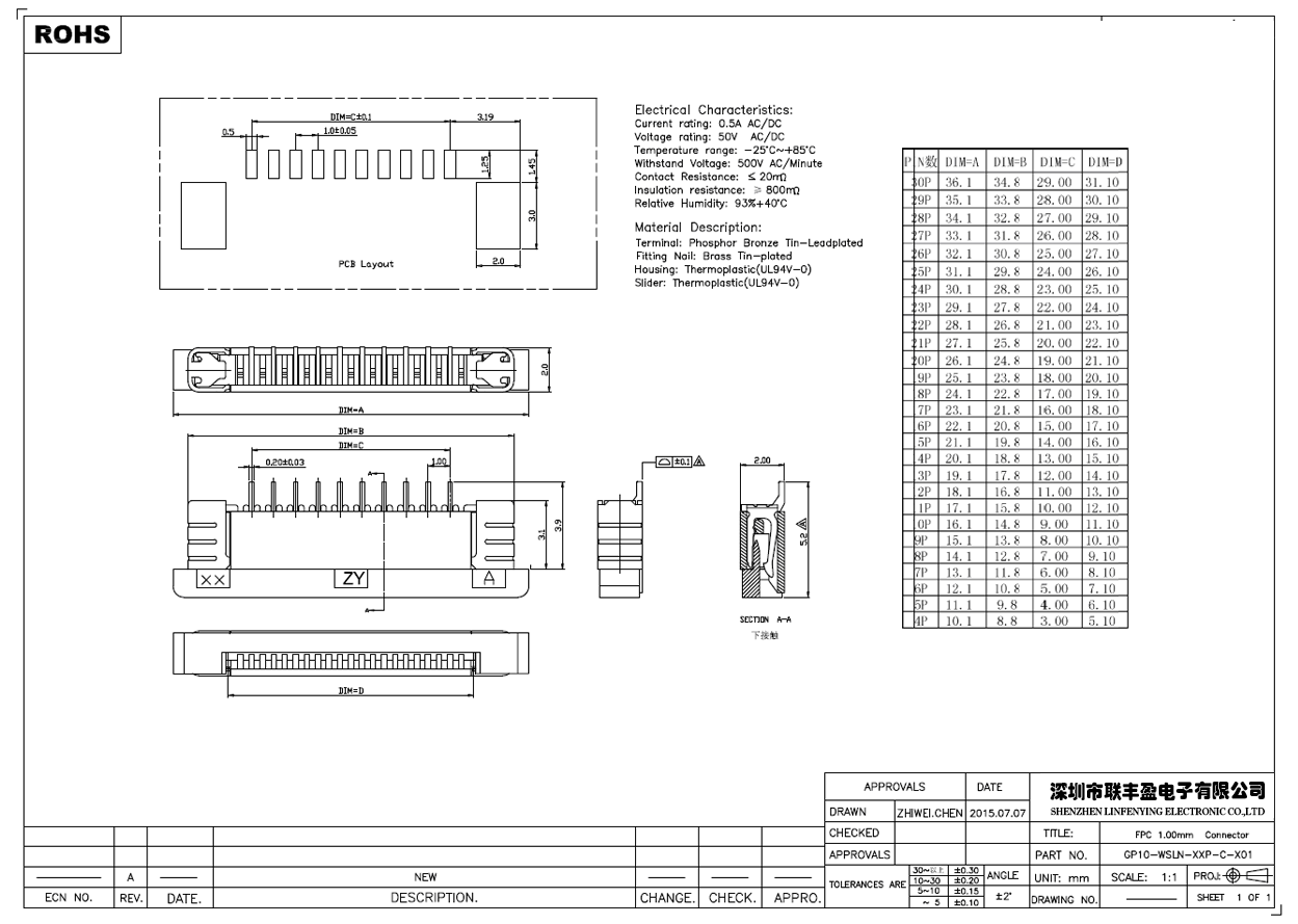產品簡介品名:FPC連接器規格:臥式貼片/90°間距:1.0mm/下接觸PIN數:4P-30P高度:2.0mm