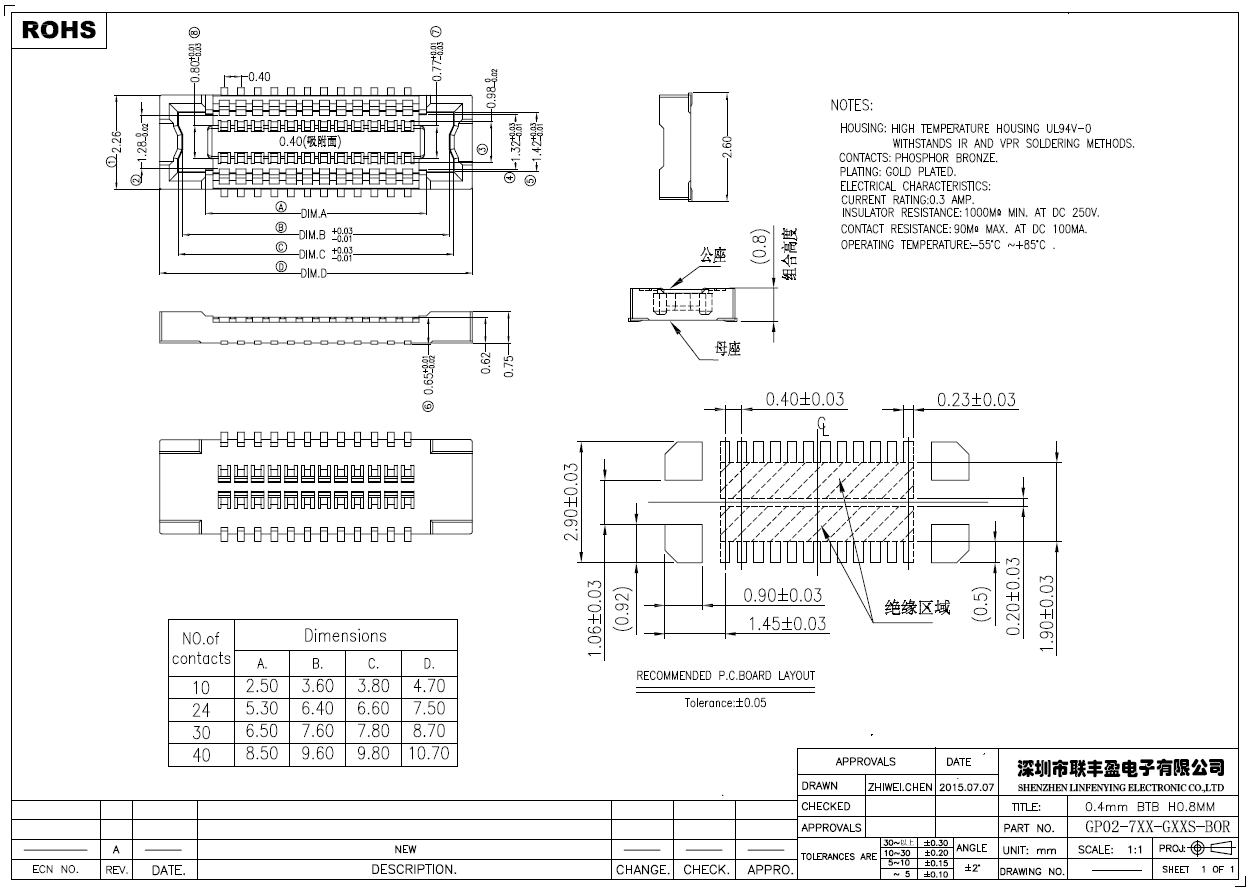 產品簡介品名:0.4mm單槽板對板連接器母座H0.8型號:LFY02-7XX-GXXS-BOR規格:0.4mm間距/立式180°PIN數:10-40PIN塑膠顏色:黑色
