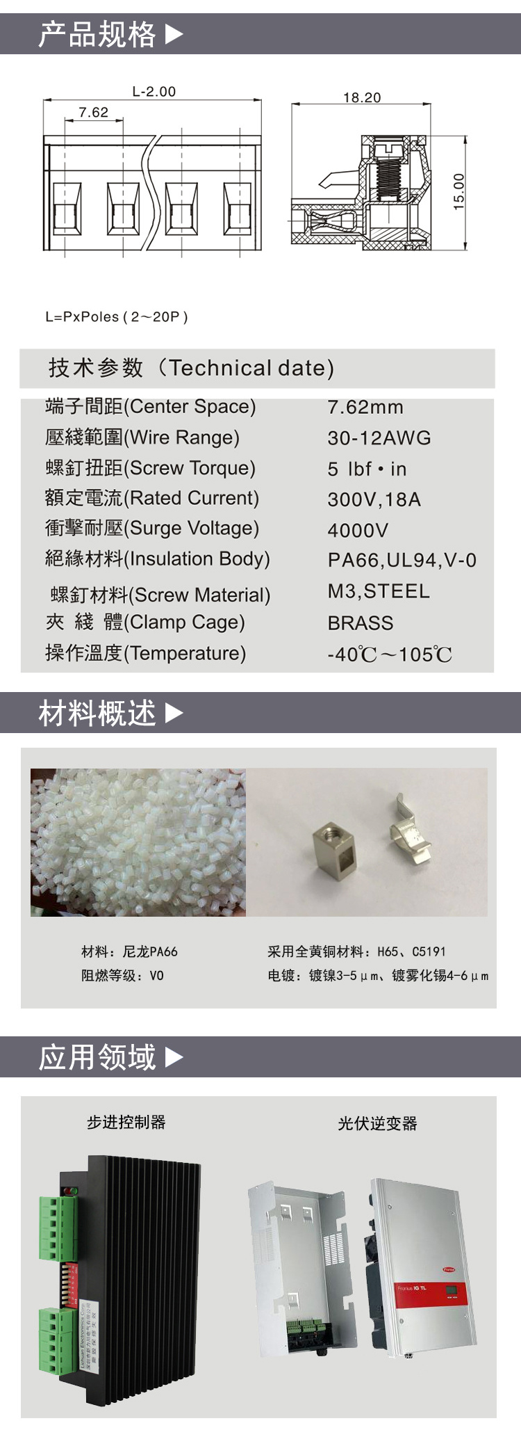 插拔式接線端子7.62間距180度直頭 300V 15A 02P-24P