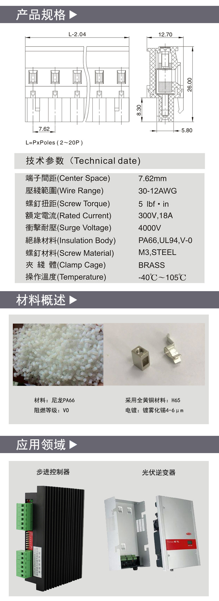 插拔式接線端子7.62間距180度直頭 300V 15A 02P-24P
