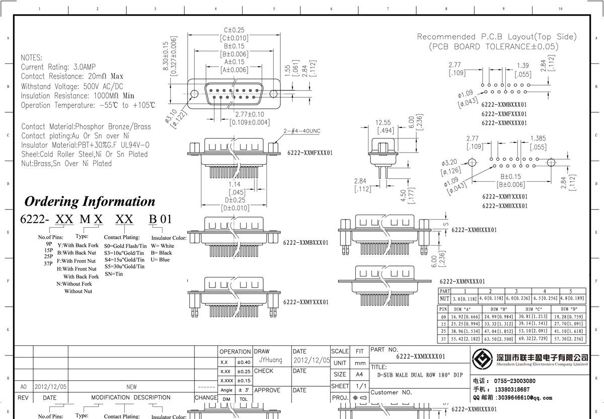 技術參數:額定電流:3.0amp電流電阻:20mΩ最大絕緣電阻:1000mΩMIN承受電壓:AC 500V /分鐘工作溫度:55oC + 105oC接觸材料:黃銅、磷青銅觸點電鍍金或錫鎳絕緣體材質:聚酯(UL94V-0)標準:PBT的+ 30%廣發殼:冷軋輥鋼,鍍鎳黃銅螺母:錫鎳板,