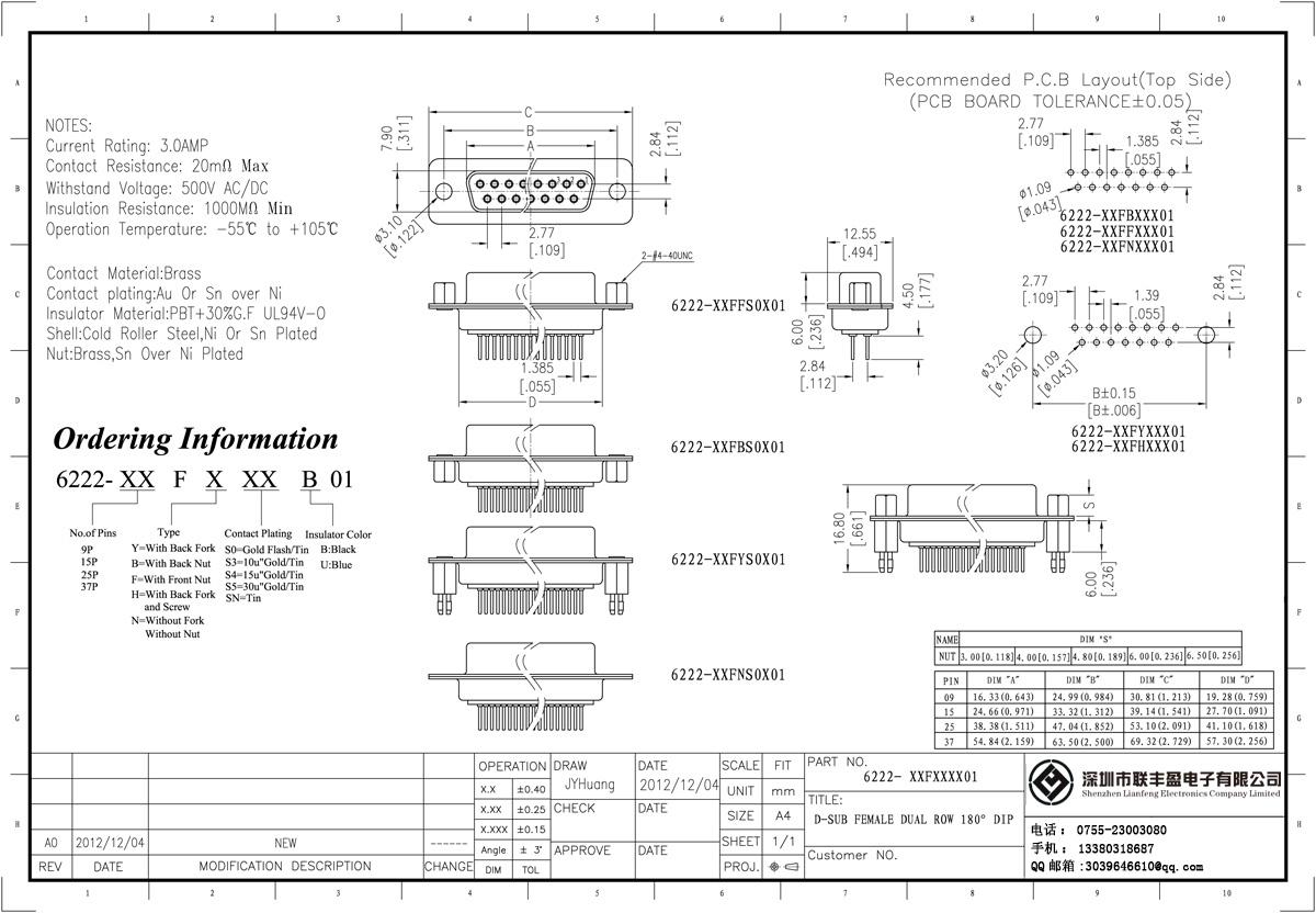 技術參數:額定電流:3.0amp電流電阻:25mΩ最大絕緣電阻:1000mΩ min 承受電壓:AC 500V /分鐘工作溫度:55﹣℃+ 105℃接觸材料:黃銅觸點電鍍金或錫鎳絕緣體材質:聚酯(UL94V-0)標準:PBT的+ 30%廣發殼:冷軋輥鋼、鍍鎳黃銅、錫在螺母:鍍鎳