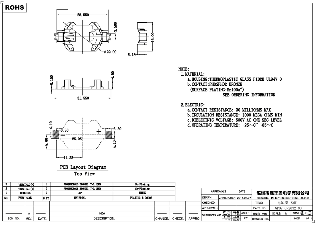 產品簡介品名:電池座產品型號:LFY07-CR2032-03電池型號:CR2032產品規格:SMT/貼片式備注:本色